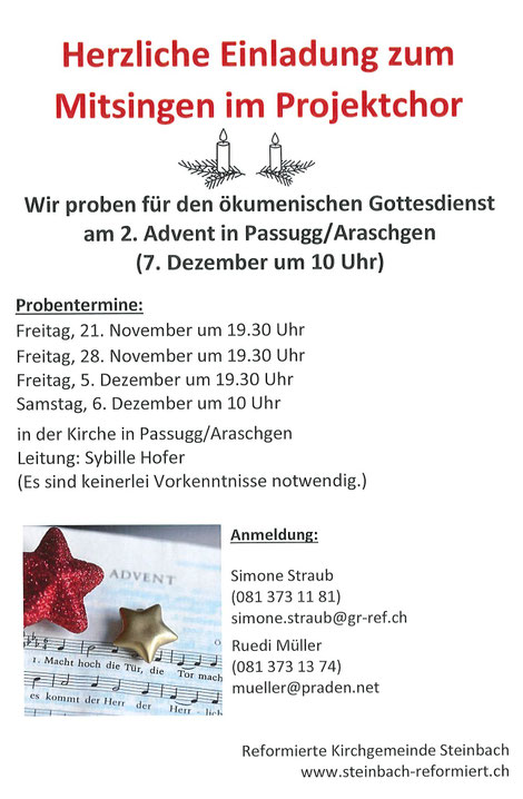 Im ökumenischen Gottesdienst am 2. Advent (7.12., 10 Uhr, Passugg) wird wieder ein Projektchor singen.