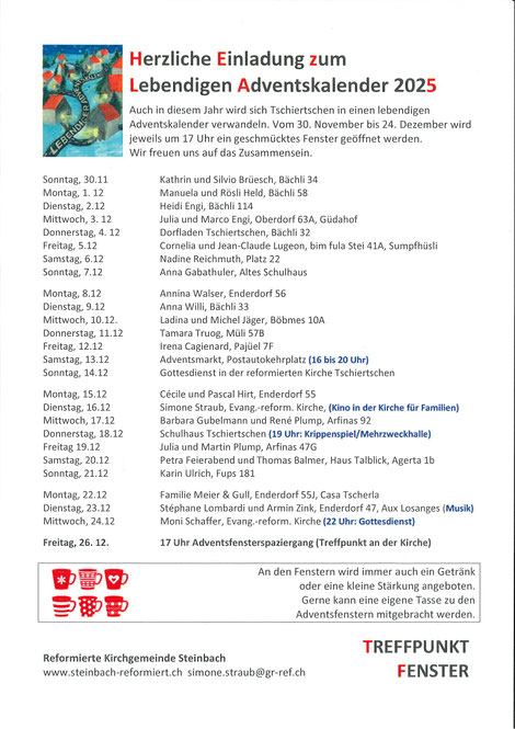 Fr, 21.11., 28.11., 5.12. um 19.30 Uhr und Sa, 6.12. (10 Uhr) in der Kirche Passugg/Araschgen.